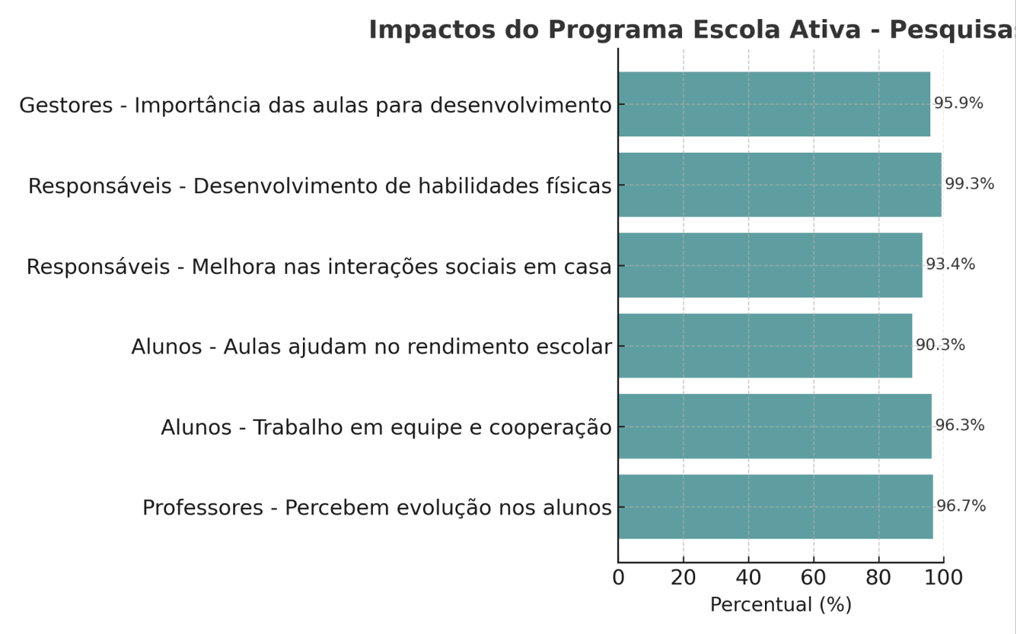 • 90,3% dos alunos relatam melhora no rendimento escolar, e 96,3% reconhecem que o esporte fortalece o trabalho em equipe.